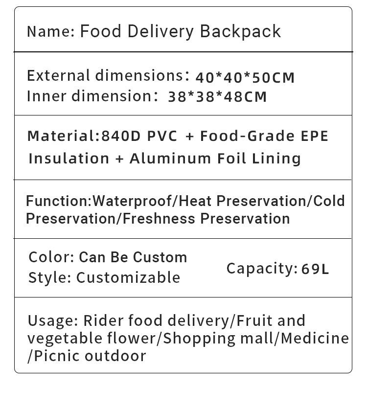 7 to 14 DaysThe 69L Insulated Delivery Backpack is engineered to bridge the gap between kitchen freshness and the customer’s doorstep. Designed specifically to combat the common industry pain points of food cooling, leakage, and rider fatigue during long shifts, this high-capacity carrier ensures that temperature-sensitive meals remain at optimal states regardless of external weather conditions. Utilizing a heavy-duty 840D PVC exterior and multi-layered food-grade EPE insulation, DeliverKingdom provides a robust solution for large-scale fleet operations. With a 12,000-square-meter facility and a dedicated team of 400 professionals, the company supports comprehensive customization—including logo printing, bespoke colorways, and structural modifications—to align with corporate identity. Every unit is crafted to meet international standards, ensuring reliability for global bulk orders and rapid fulfillment.