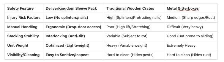 The DeliverKingdom Safety-First Sleeve Pack is designed to mitigate the inherent risks associated with traditional industrial packaging, such as heavy wooden crates and sharp-edged metal bins. Many warehouse operations struggle with rising insurance premiums and labor downtime caused by splinters, protruding nails, and the physical strain of handling non-collapsible, heavy equipment. This system solves these safety concerns by utilizing lightweight yet high-strength polymers and a smooth, splinter-free finish. Featuring an ergonomic drop-door design, it eliminates the need for workers to overstretch or unsafely bend when retrieving goods from deep within the container, directly improving workplace safety scores and operational throughput for enterprise-level logistics.