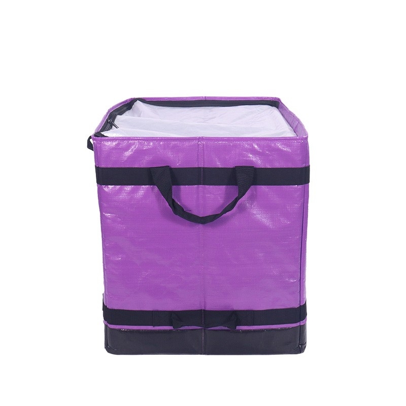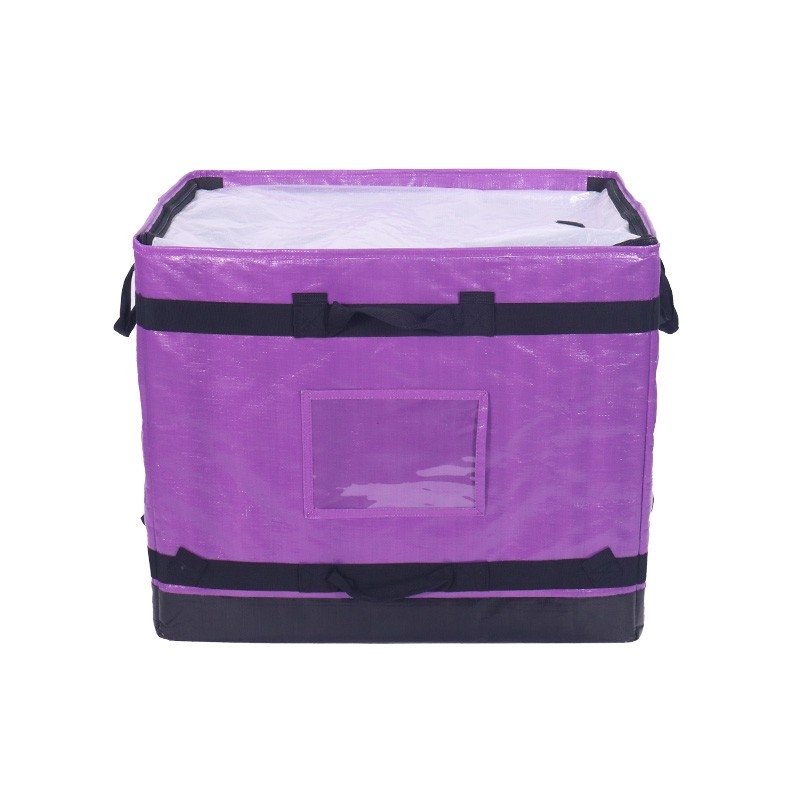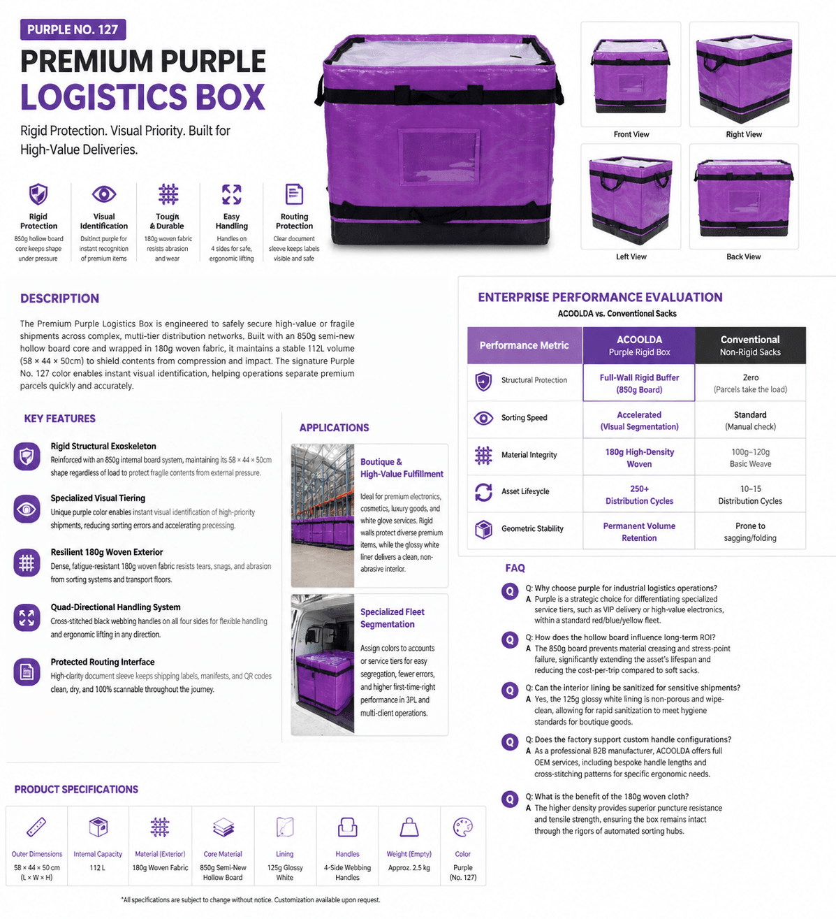 112L Purple logistics box with 850g rigid board core. Specialized for high-value parcel sorting and boutique delivery. 180g reinforced weave, ID window, and 4-sided handles. B2B fleet grade.